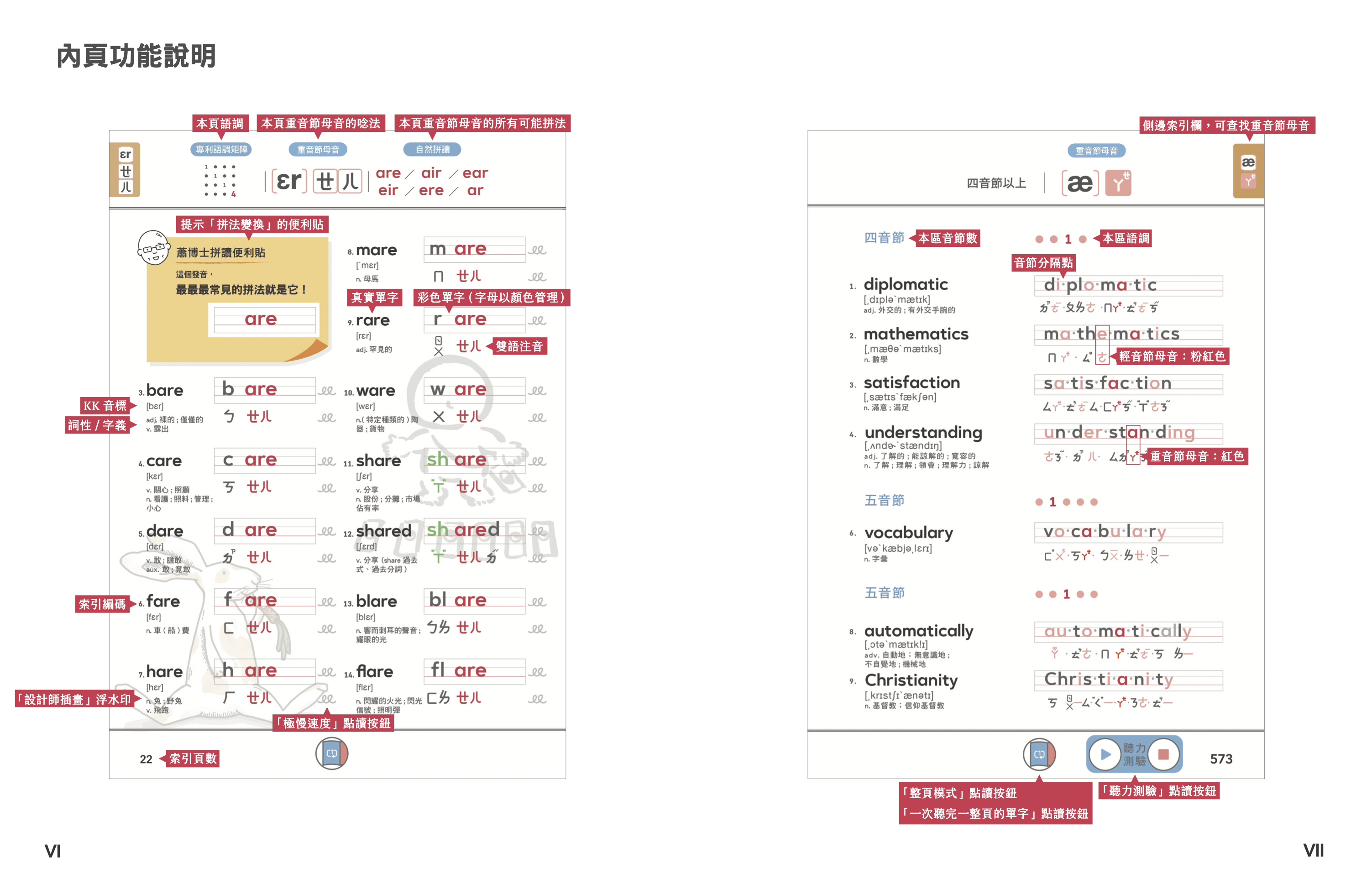 本書的單字,不是一般的 A-Z 排列法, 而是先排「單音節」單字、再排「雙音節」單字、再排「三音節」單字、最後排「四音節以上的」單字。同樣音節數的字,再按照重音節母音分類排列。
