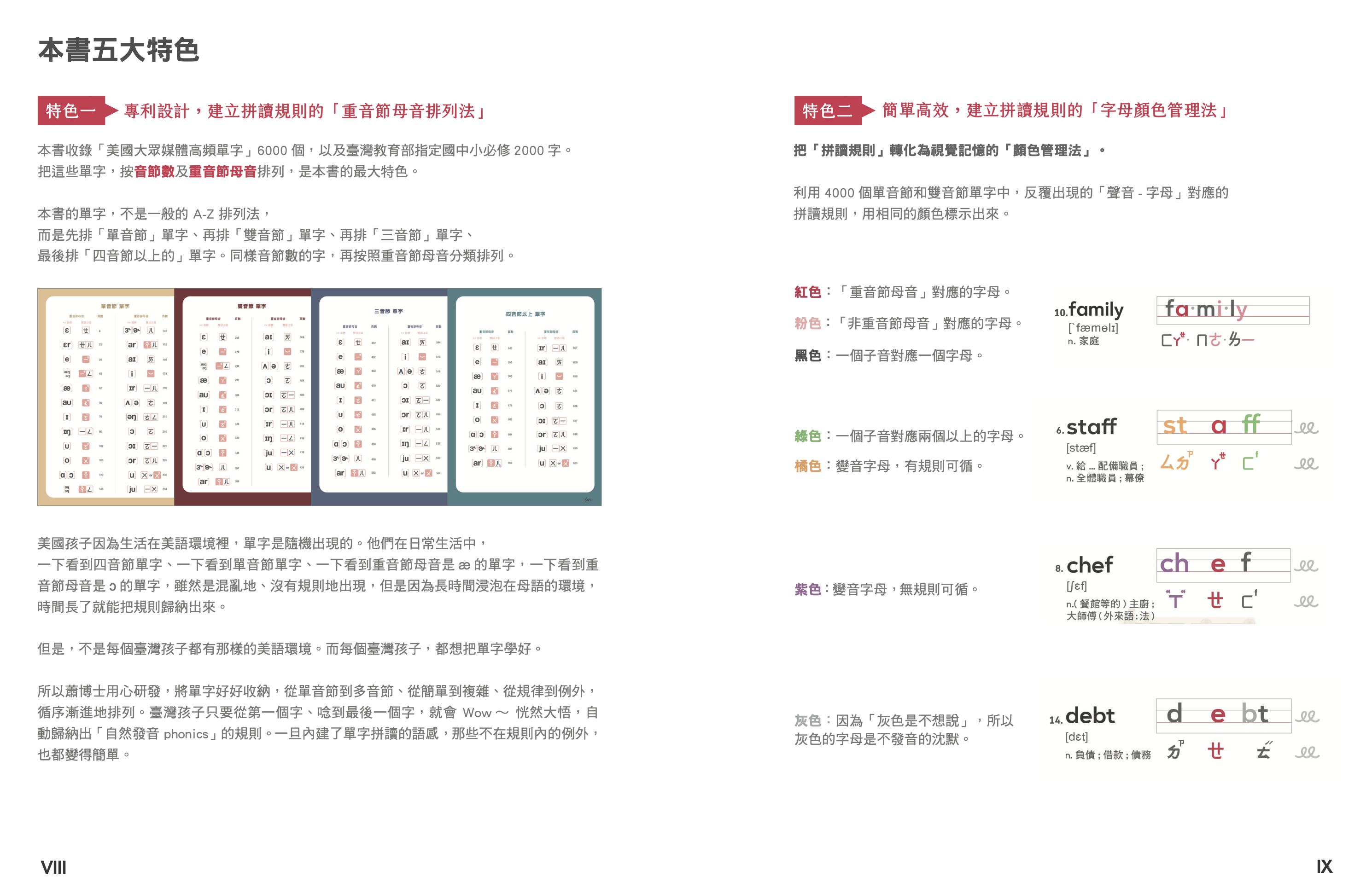 把「拼讀規則」轉化為視覺記憶的「顏色管理法」。利用 4000 個單音節和雙音節單字中,反覆出現的「聲音 - 字母」對應的 拼讀規則,用相同的顏色標示出來。