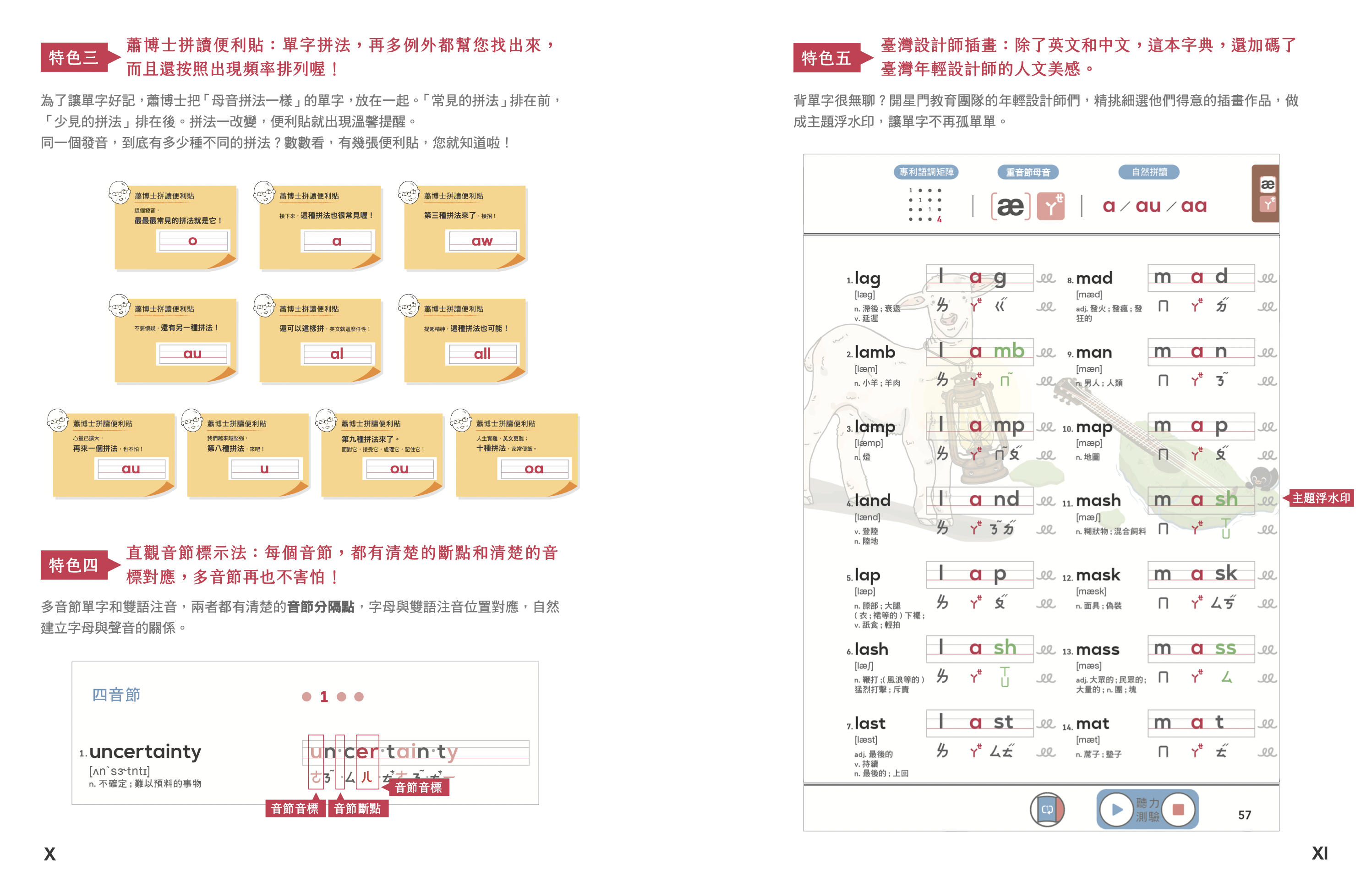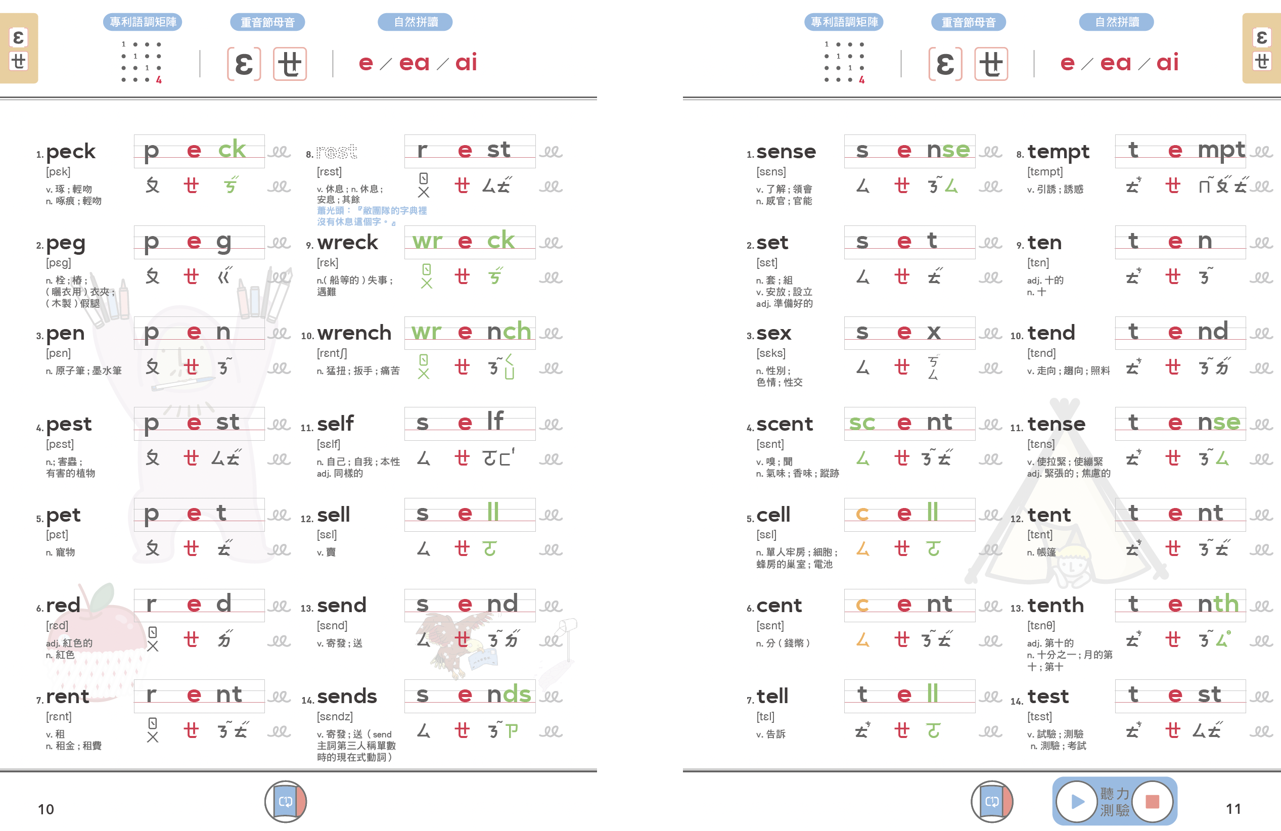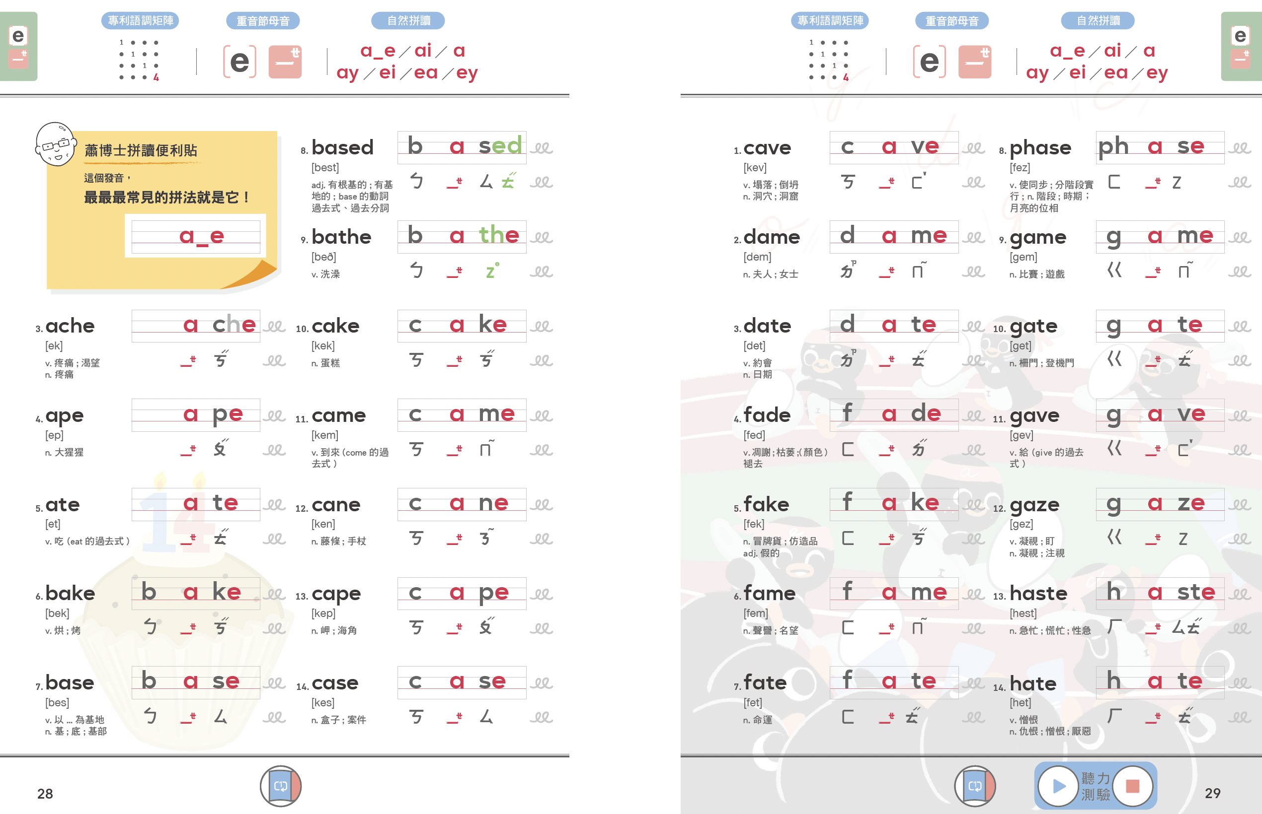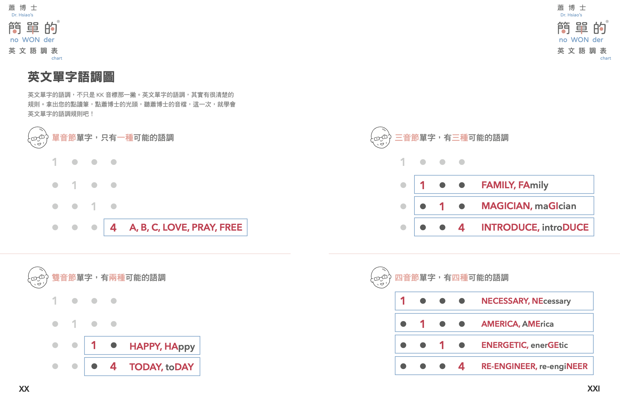 蕭博士用心研發,將單字好好收納,從單音節到多音節、從簡單到複雜、從規律到例外,循序漸進地排列。臺灣孩子只要從第一個字、唸到最後一個字,就會 Wow~ 恍然大悟,自動歸納出「自然發音 phonics」的規則。一旦內建了單字拼讀的語感,那些不在規則內的例外,也都變得簡單。